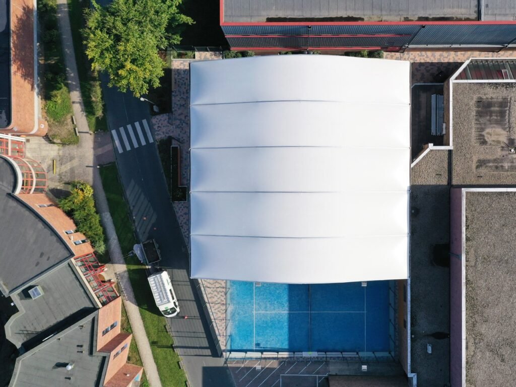 Al cubrir más de dos pistas es importante tener en cuenta las condiciones de juego. Por eso, disponemos de techos presurizados, lonas translúcidas u opacas, faldones antireflejos, cortinas microperforadas, abatibles o laterales fijos de panel sándwich. Puedes elegir hasta el color.