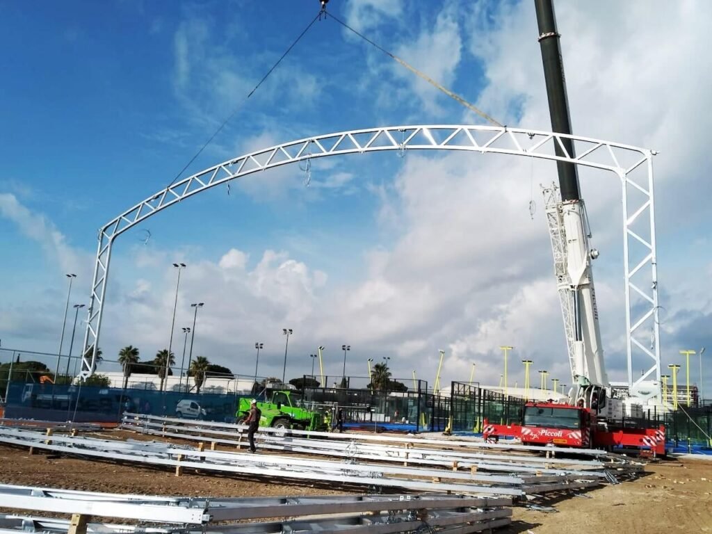 Es un pabellón modular con estructura de aluminio o acero, cubierto con una membrana textil y PVC de alta resistencia. Este modelo de medio formato permiten cubrir desde dos hasta seis pistas de pádel.